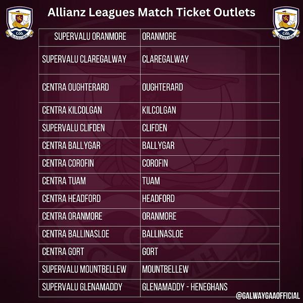 Please note that there will be no tickets on sale at Pearse Stadium for Allianz League Fixtures, tickets can be bought online in advance (details on link below) or via the attached list of SuperValu and Centra outlets around Galway.