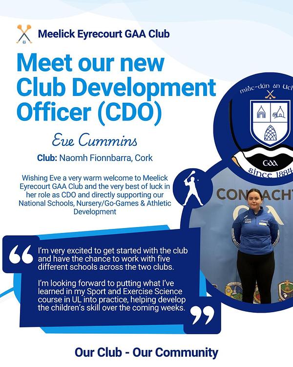 Meelick Eyrecourt GAA would like to wish a warm welcome to Eve Cummins who will work as our CDO for 2025!