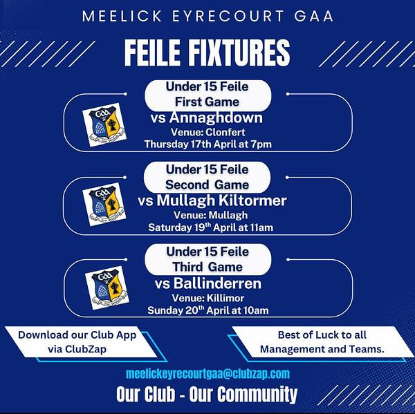 Fixtures for the week ahead. Best of luck to all teams especially our Fr. Joe Walsh's Feile team who play 3 games this weekend!